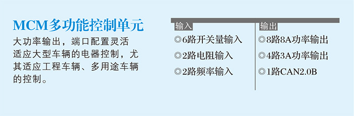 大功率输出,端口配置灵活适应大型车辆的电器控制,尤其适应工程车辆、多用途车辆的控制。